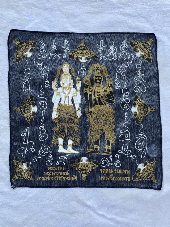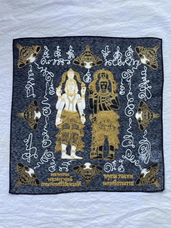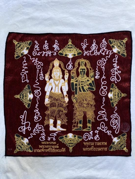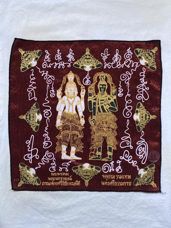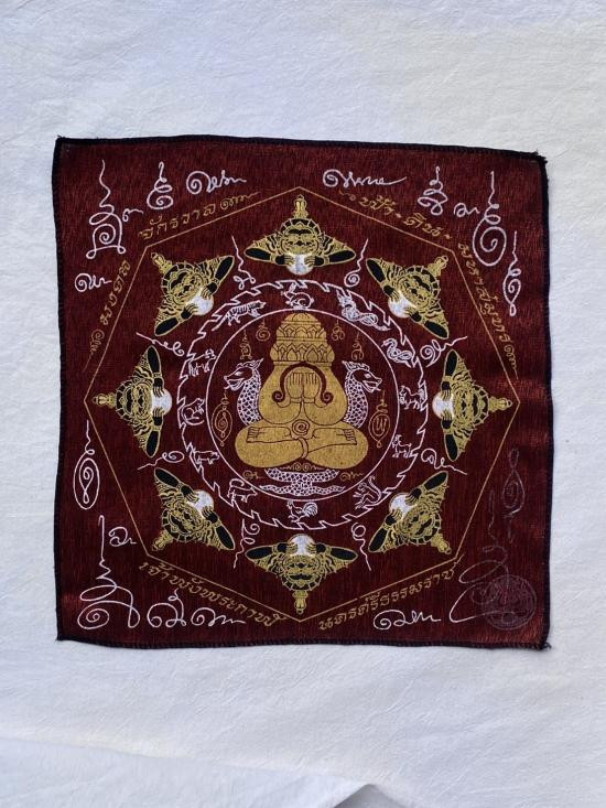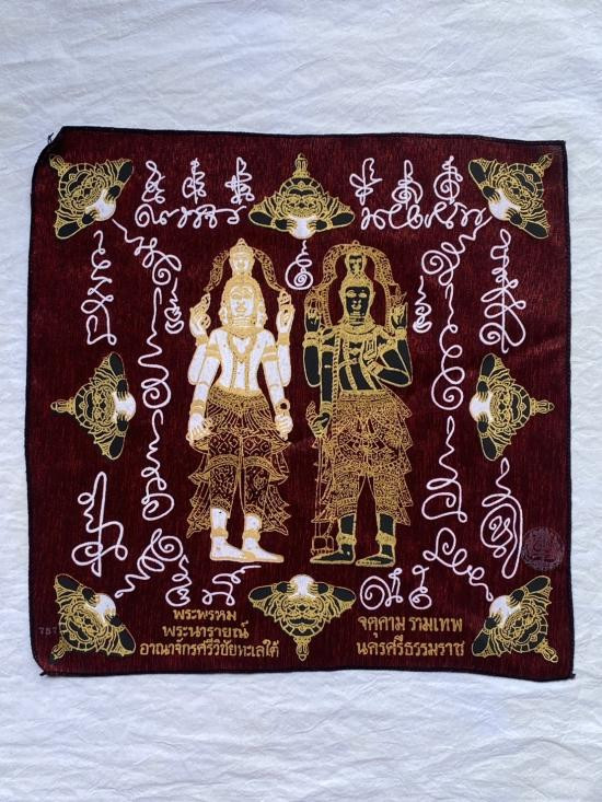 เคาะเดียวแดง ผ้ายันต์ พระพรหม พระนารายณ์ มิ่งมงคล รุ่นมงคลจักวาล ขนาด40/40ซม มีตราประทับ-มีรันเลข สีแดง |