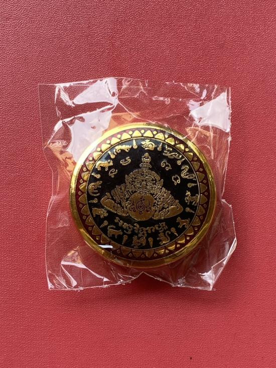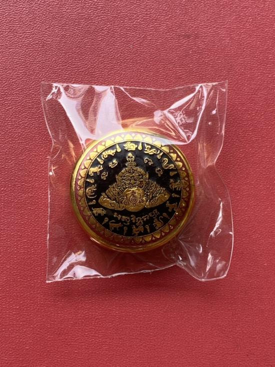 เคาะเดียวแดง สีผึ้งพระราหู รุ่น มงคลจักรวาล เนื้อ โลหะชุบทองลงยาสีดำขอบสีดำ ขนาด3.2ซม |