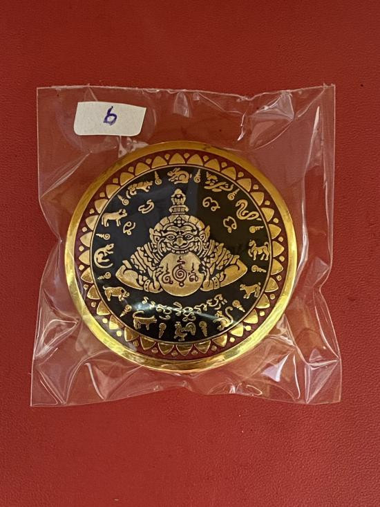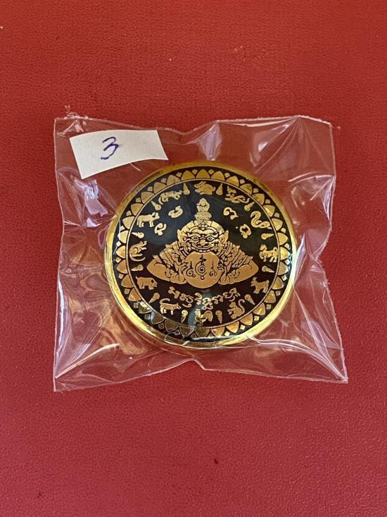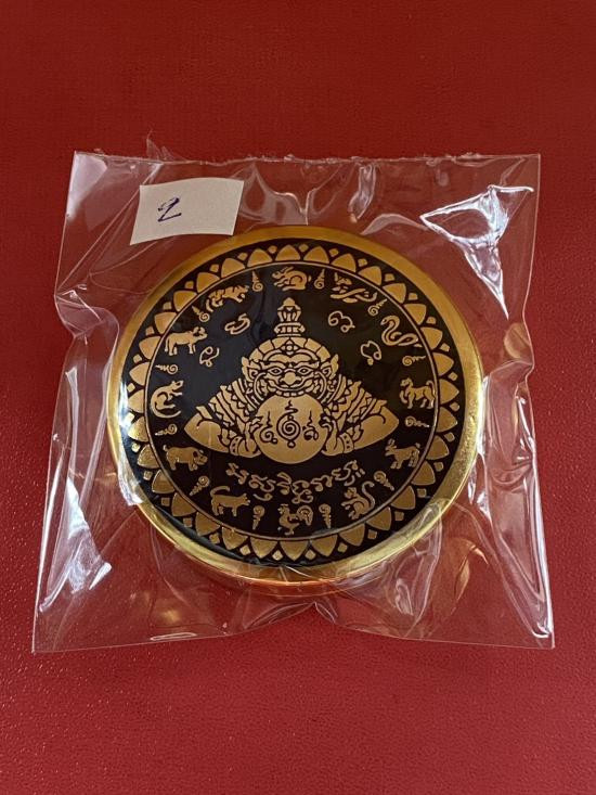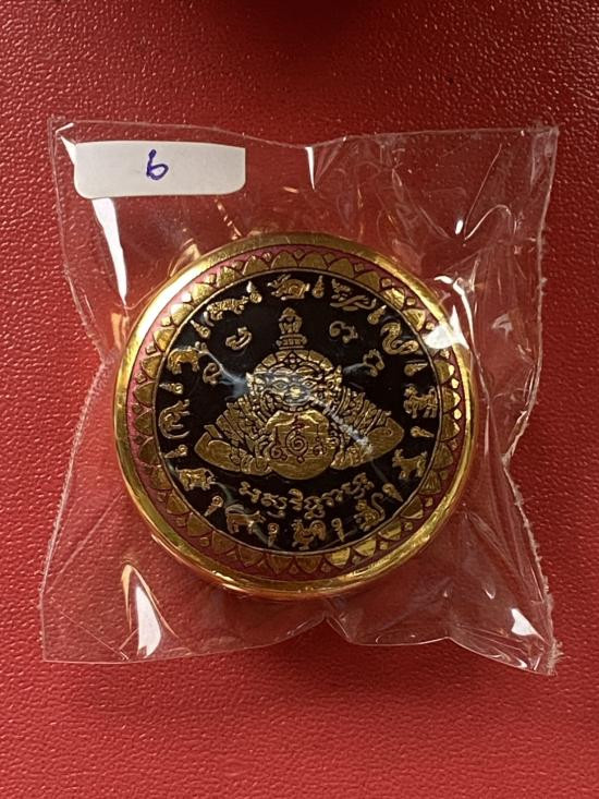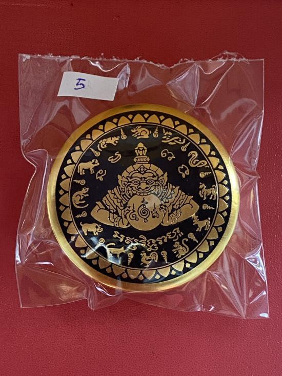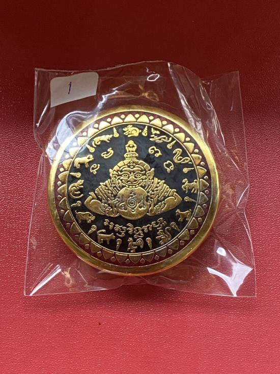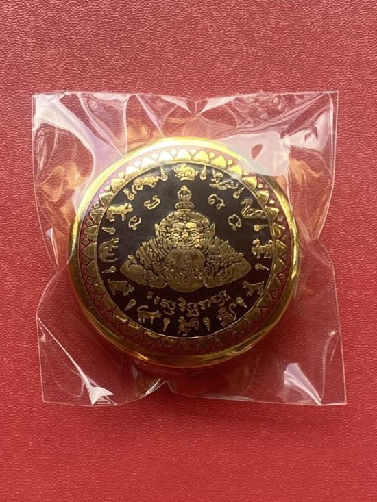 เคาะเดียวแดง สีผึ้งพระราหู รุ่น มงคลจักรวาล เนื้อ โลหะชุบทองลงยาสีดำขอบสีแดง ขนาด5ซม |