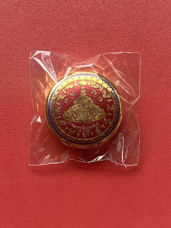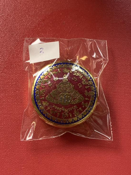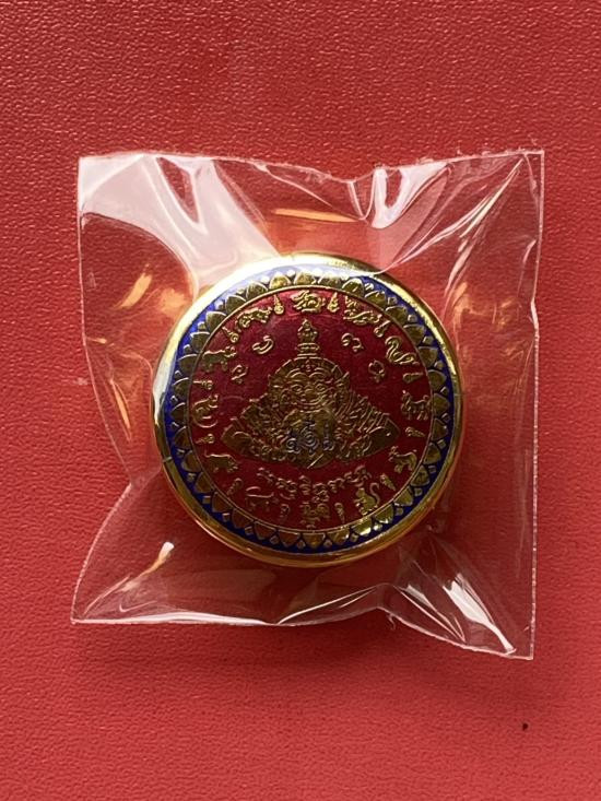 เคาะเดียวแดง สีผึ้งพระราหู รุ่น มงคลจักรวาล เนื้อ โลหะชุบทองลงยาแดงขอบดำ ขนาด3.2ซม |