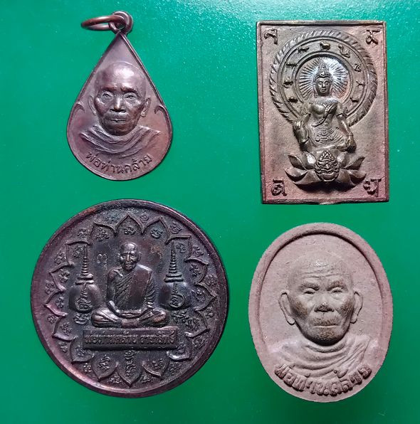 140 .- วัดใจ.@@ เหมา 4 รายการ > "เหรียญหยดน้ำ + พ่อท่านคล้าย วาจาสิทธิ์ " รุ่นมหามงคล " + เหรียญหล่อองค์พ่อจตุคามรามเทพ หลังหลวงพ่อคล้าย + พระเนื้อผงว่านผสมดินกากยายักษ์ พ่อท่านคล้าย รุ่นพุทธคุณ 64 วั