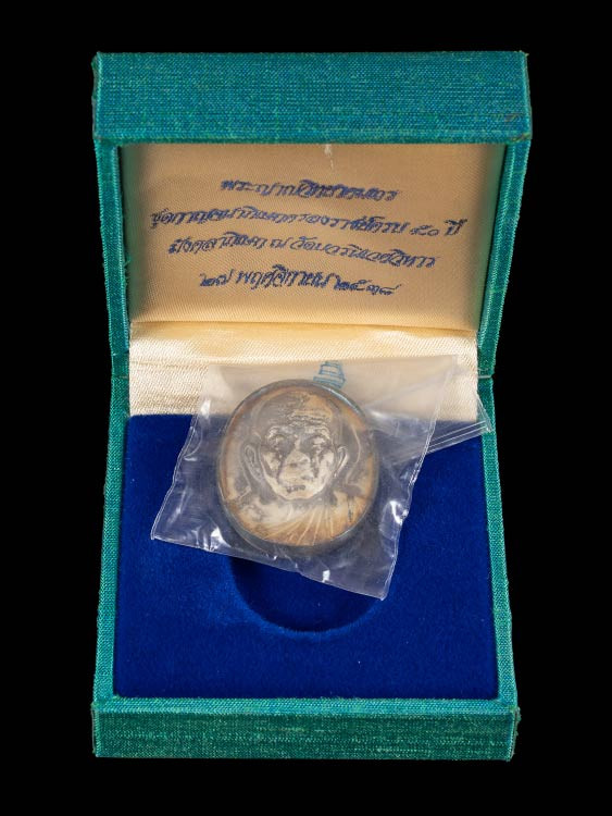 หลวงพ่อพัฒน์ วัดห้วยด้วน เศรษฐีทวีทรัพย์ 100 ล้าน เลข 799 เนื้อทองฝาบาทรลงยาม่วง พร้อมดล่องเดิม |