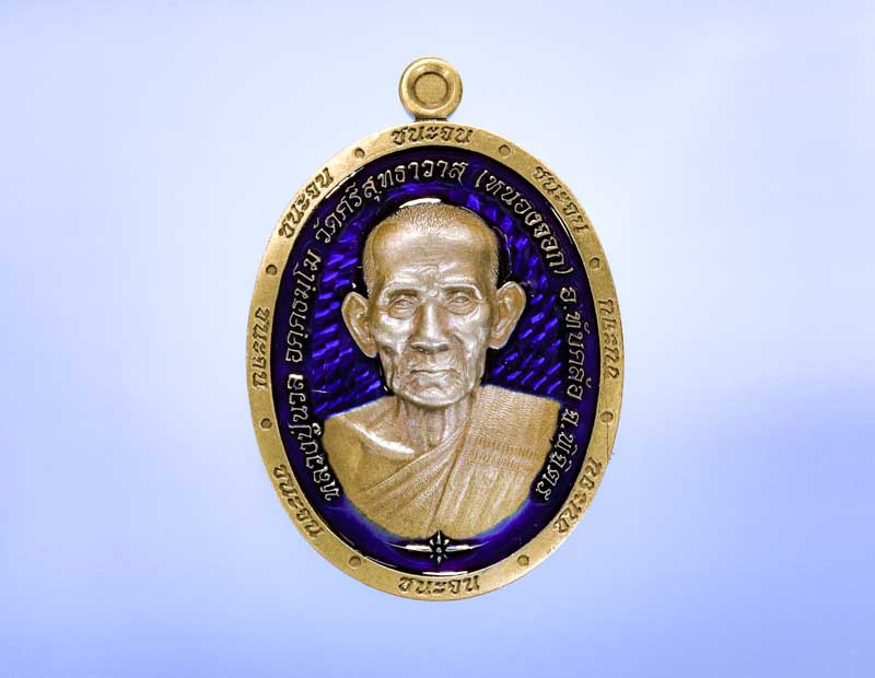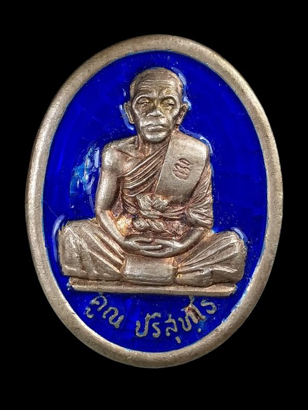 เหรียญเจริญสุข หลวงพ่อแสวง วัดลาดปลาดุก จ.นนทบุรี เนื้อเงินลงยาสีน้ำเงิน |