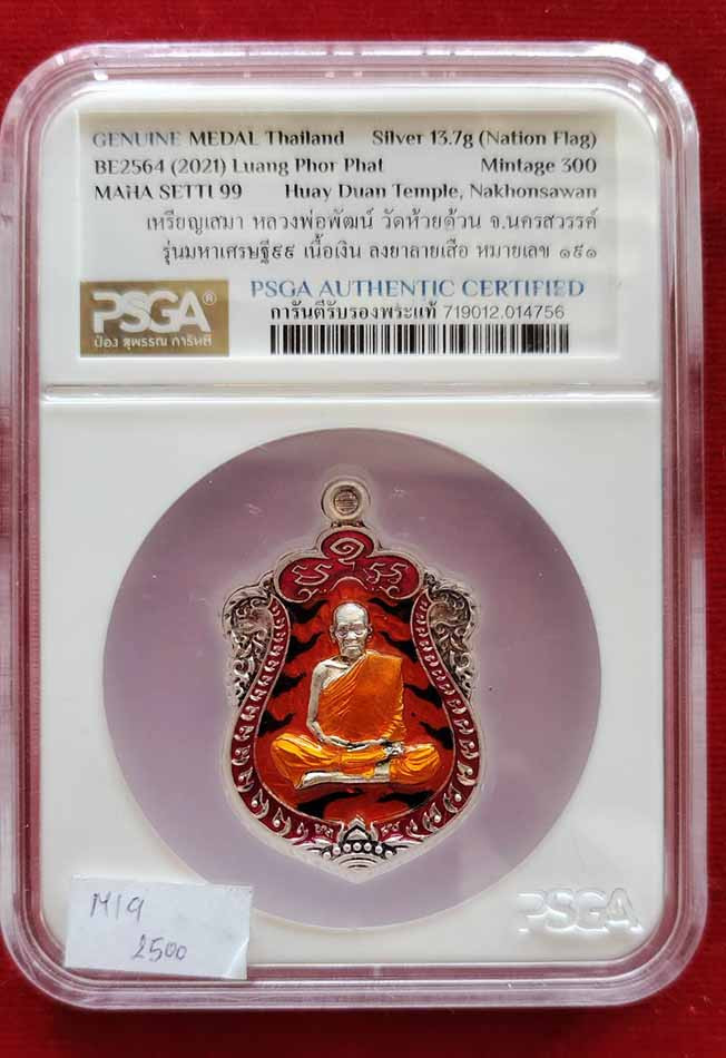 เหรียญเสมา ดวงเศรษฐี๙๙ รวย รวย รวย หลวงพ่อพัฒน์ วัดห้วยด้วน (ขนาดเหรียญสูง 4.0 ซ.ม.) เนื้อเงิน ลงยาลายธงชาติ หมายเลข 53 |