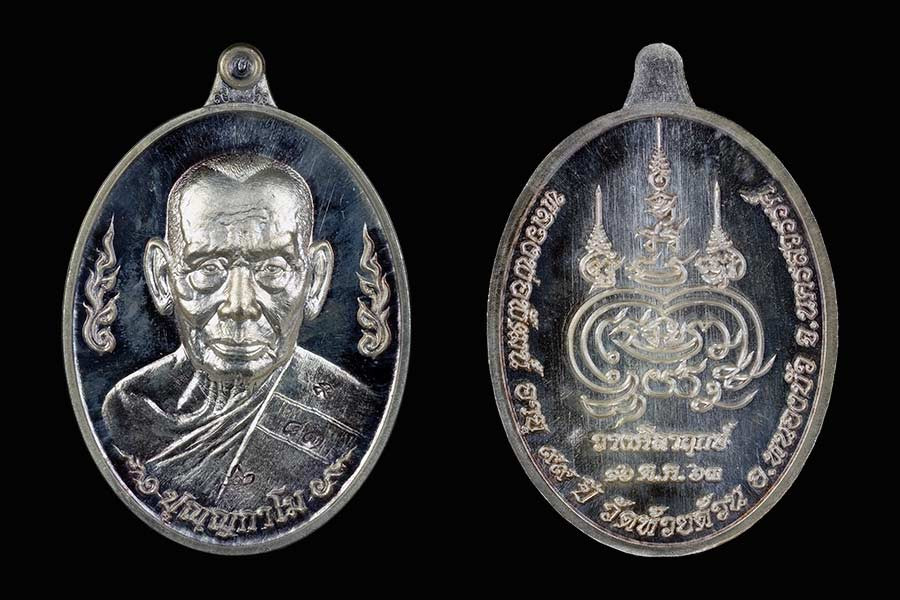 เหรียญหลวงพ่อรวยรุ่นอายุวัฒนะมงคล96ปี60เนื้อกะไหล่เงินบล๊อกยันต์ขาด(บล๊อกแรก)วัดใจไปครับ |