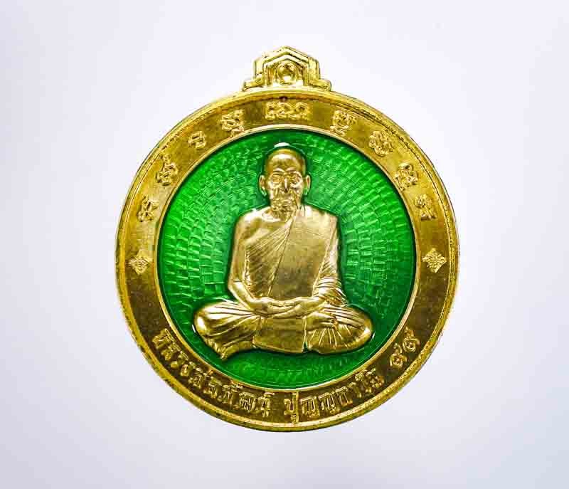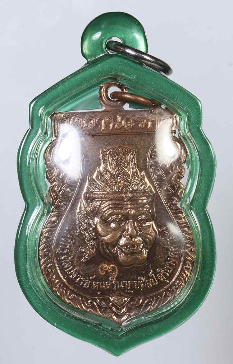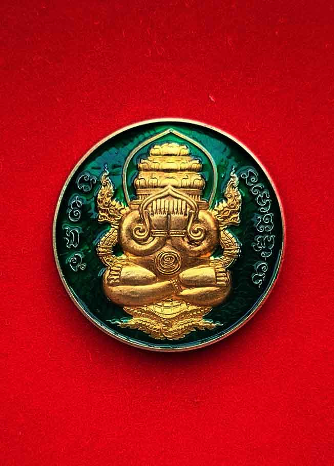 เหรียญพระปิดตาพังพระกาฬ หลังพหุรมาน หลวงปู่มหาศิลา สิริจันโท รุ่นรวยโชคอนันต์ เนื้อทองฝาบาตร ลงยาเขียว no.1192 แยกจากชุดกรรมการลงยา กล่องเดิม |