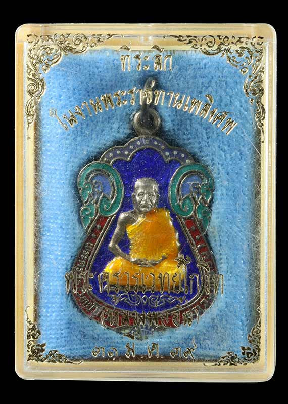 เหรียญท้าวมหาพรหม รุ่นเจ้าสัวพันล้าน(บอย ท่าพระจันทร์) เนื้อฝาบาตรลงยาพื้นดำขอบแดง เลขโค๊ต ๑๖๑ พร้อมกล่องเดิม |