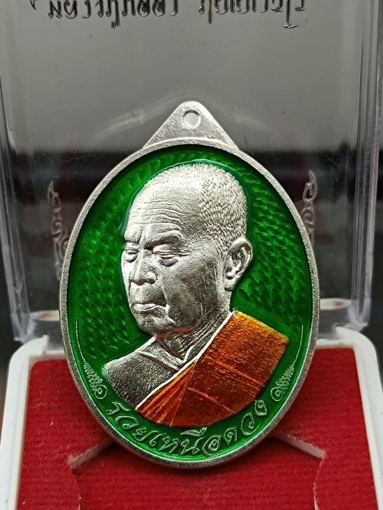 เหรียญ รุ่น รวยเหนือดวง หลวงพ่อรวย อคฺคสาโร วัดมาบตาพูด จ.ระยอง เนื้อเงินลงยาสีเขียว ลงยาจีวร หมายเลข 32 |