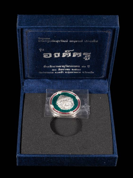 เคาะเดียวแดง 100 เหรียญพญาครุฑ รุ่น เจ้าสัวเวนไตย หลวงปู่ฟู อติภทฺโท วัดบางสมัคร จ.ฉะเชิงเทรา เนื้ออัลปาก้า ลงยาสีแดง - เขียว -เหลือง กล่องเดิม |