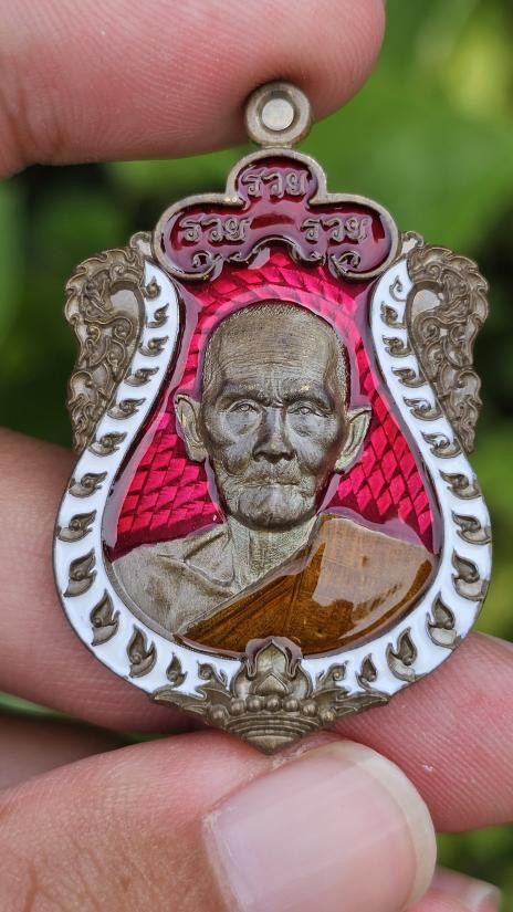 เหรียญเสมา8รอบรุ่นรวยรวยรวย เนื้อชนวนลงยาพื้นชมพูขอบขาวบนแดงลงยาจีวร หลวงปู่ฝั้น ปสาโท วัดหน้าผา |