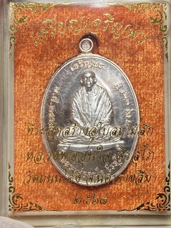 เหรียญเจริญพร หลวงพ่ออุ่นใจ จิรสุโภ วัดถนนโค้ง จ.นครราชสีมา นวะโลหะหน้ากากเงินแท้ |