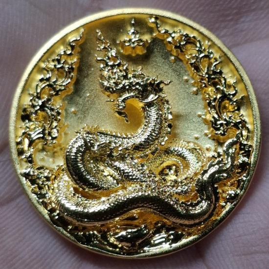 เหรียญองค์พญานาคราช - หลังยันต์สิบทิศ เนื้อกระไหล่ทอง รุ่นร่วมบุญสร้างโบสถ์คำชะโนด ของท่านอาจารย์ ไพโรจน์ รื่นวิชา
