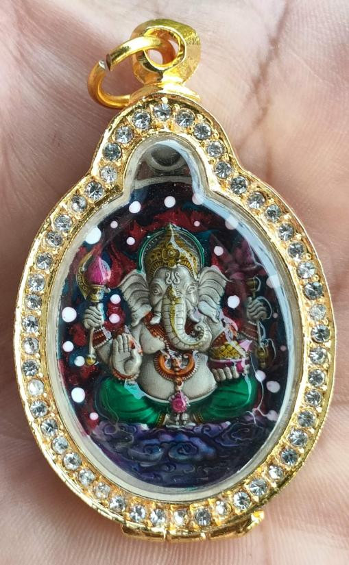 เหรียญพระพิฆเนศรุ่นพิณเณตร รวย รวย หลวงปู่ศิลา อุปถัมภ์สร้างโบสถ์มหาอุตม์ วัดบ้านโนนเดื่อ จ.ร้อยเอ็ด เนื้ออัลปาก้าซาติน ลงยาแกแล็คซี่ เลี่ยมกรอบชุบทองอิตาลี หมายเลข ๔๕ พร้อมกล่อง ผลรวมได้๙ ลงยาสวยมาก |