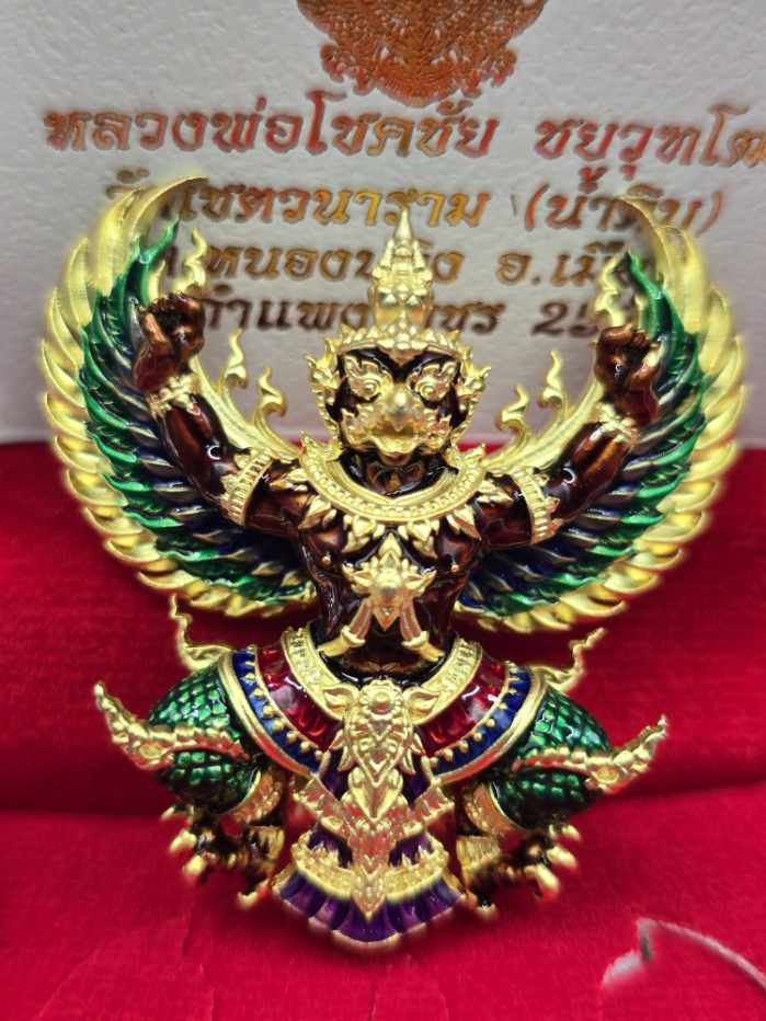 พญาครุฑ รุ่นมีโชคพันล้าน หลวงพ่อโชคชัย วัดน้ำดิบ เนื้อมหาชนวนชุบทองลงยากายน้ำตาล สร้าง 80 องค์ หมายเลข 66 |