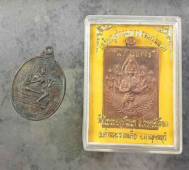 เหรียญท่านท้าวมหาพรหมเทพปฏิมา ไม่ทราบปี + เหรียญ ท้าวมหาพรหม รุ่นแรก พรหมเพชร วัดไทรทองพัฒนา กาญจนบุรี |