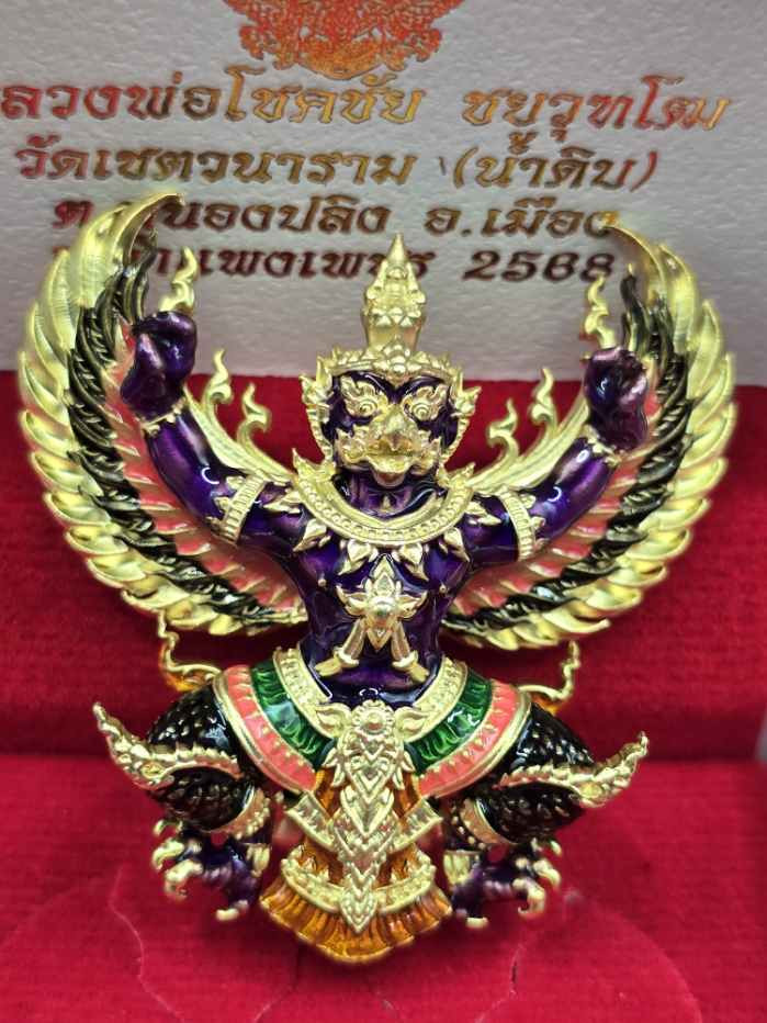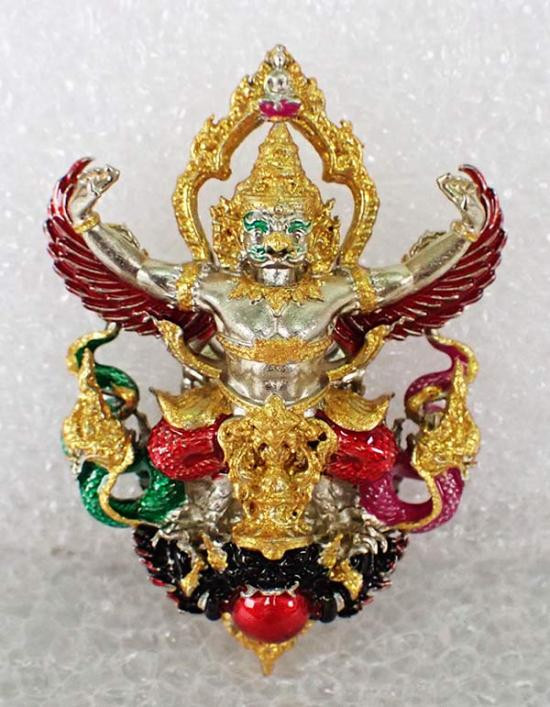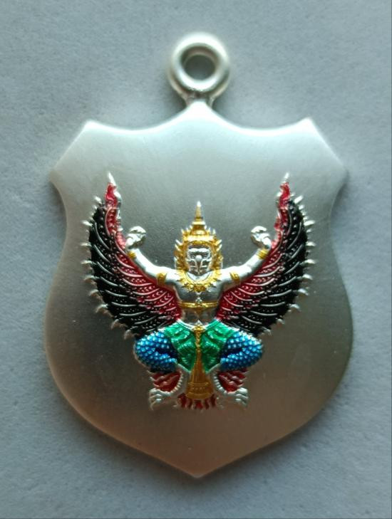 วัดใจเคาะเดียวแดงจ้า เหรียญโล่ห์ครุฑ เนื้อชุบเงินลงยาครุฑ พระอาจารย์ประสูติ วัดในเตา เคาะเดียวแดงจ้า