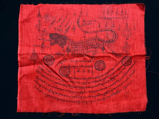 ผ้ายันต์เสือถีบจักร อาจารย์อุทัย ดุจศรีวัชร์ มีหลวงปู่สุภา และท่านอาจารย์ชุม ไชยคีรี ร่วมปลุกเสกในพิธี พิมพ์หมึกดำบนผ้าสีแดง ขนาดประมาณ 11 x 13.5 นิ้ว สวย เดิม |