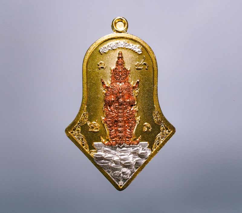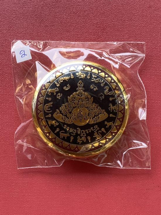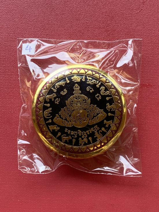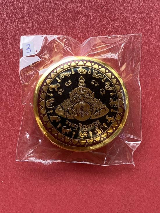 เคาะเดียวแดง สีผึ้งพระราหู รุ่น มงคลจักรวาล เนื้อ โลหะชุบทองลงยาสีดำขอบสีแดง ขนาด5ซม |