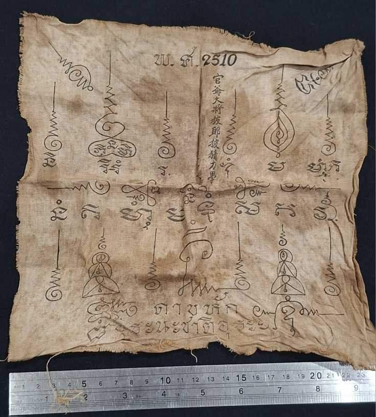 วัดใจ *** ผ้ายันต์เกราะเพชรหลวงปู่พูลทรัพย์ วัดอ่างศิลา ชลบุรี ปี 2538 ขนาด 10 x12 นิ้ว |
