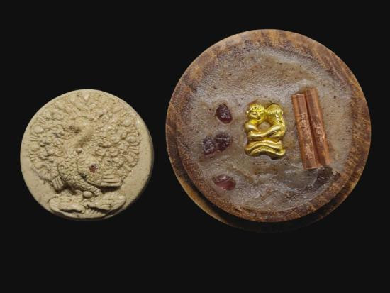 เคาะเดียวแดง พญายูงคำ รุ่นแรก เนื้อเกสรทั้งห้า และ ตลับไม้สีผึ้งเนื้อหอม รังผึ้งร้าง ขวางเดือนขวางตะวัน รุ่นแรก ฝังอิ่น ตะกรุด ในเมตตาบารมี เจ้าปู่จั่นต่า กาวิสาละ ครูบากฤษดา เมตตาเษก |