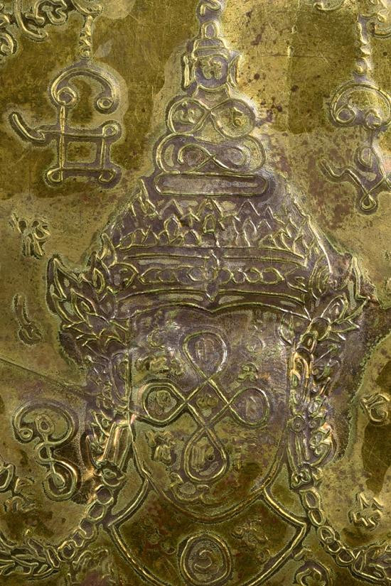 แผ่นทองเหลือง จารมือ ยันต์พระลักษณ์ หน้าทอง ขนาด 5 คูณ 5 นิ้ว ปิดทอง เคลือบพลาสติก มาแต่เดิม |