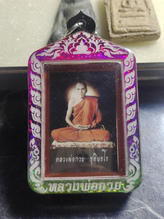 รูปถ่ายย้อนยุค หลวงพ่อกวย ฉากหลังตะวัน รุ่นเมตตาศิษย์ ปี 2563 ปั๊มเด้งหน้าเด้งหลัง พร้อมตลับเลเซอร์สลักชื่อหลวงพ่อ |