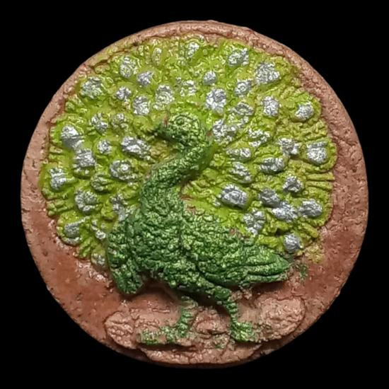 พญานกยูงคำนำโชค เนื้อมวลสารผสมน้ำหมากครูบาออ เพ้นท์สีเขียว หลังแผ่นเงินจาร เลข 14 สร้างแค่ 15 องค์ เจ้าปู่จันต่า ครูบาจันทรังษี และครูบากฤษดา วัดสันพระเจ้าแดงเมตตาร่วมปลุกเสก พร้อมใบฝอยเดิม |