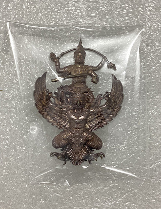 พญาครุฑ รุ่นมีโชคพันล้าน หลวงพ่อโชคชัย วัดน้ำดิบ เนื้อมหาชนวนชุบ3kลงยากายม่วง สร้าง 80 องค์ หมายเลข 50 |