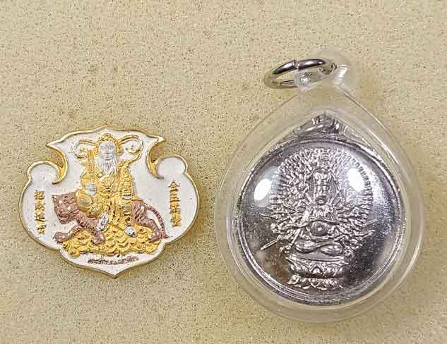 เหรียญ "กังสดาล สะท้านแผ่นดิน" เทพเจ้าไฉ่ซิ่งเอี้ย วัดมังกรกมลาวาส (เล่งเน่ยยี่) กรุงเทพฯ ปี 2553 เนื้อสามกษัตริย์ +เหรียญเจ้าแม่กวนอิม พันมือ |