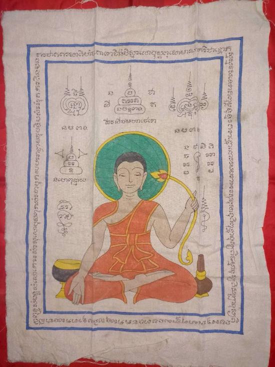 A3214.ผืนใหญ่!! ผ้ายันต์ หลวงพ่อผุย วัดหน้าพระธาตุ พนัสนิคม ชลบุรี เคาะเดียวเเดง |