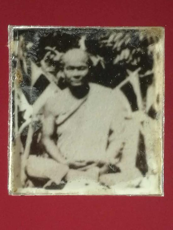 รูปถ่ายอัดกระจกพระอาจารย์เบ๊นซ์ วัดราชาธิวาส ฉากซีเปียหลังจารหมึก |