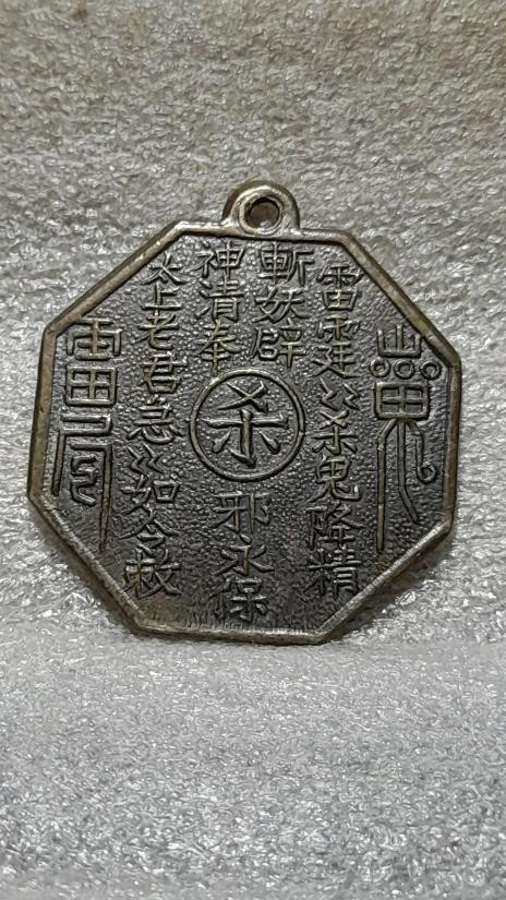 วัดใจเคาะเดียว........100.......เหรียญยันต์ฮู้จีนป้องกันภัย แปดเหลี่ยม​ หน้ายันต์จีน​ ด้านหลังยันต์ป๋วยโข๊ย(ยันต์แปดทิศ)​ เก่า |