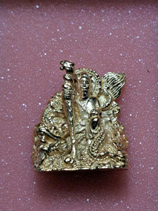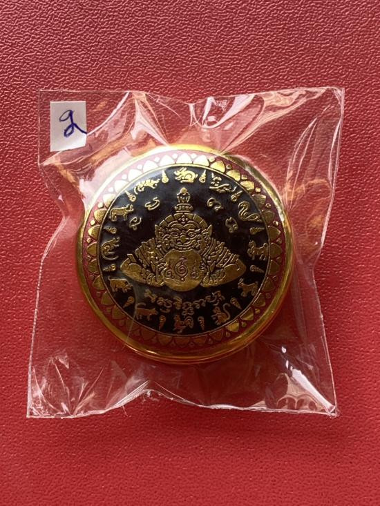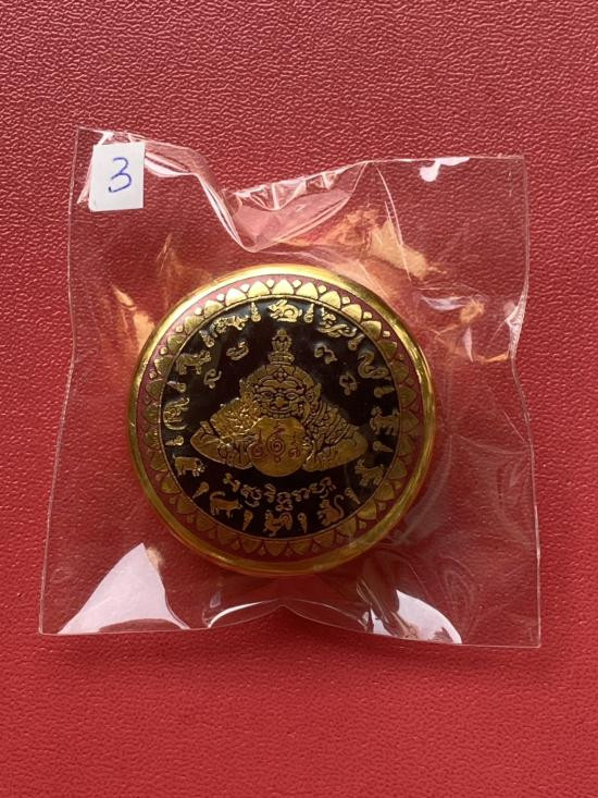 เคาะเดียวแดง สีผึ้งพระราหู รุ่น มงคลจักรวาล เนื้อ โลหะชุบทองลงยาสีดำขอบสีแดง ขนาด 3.2ซม |