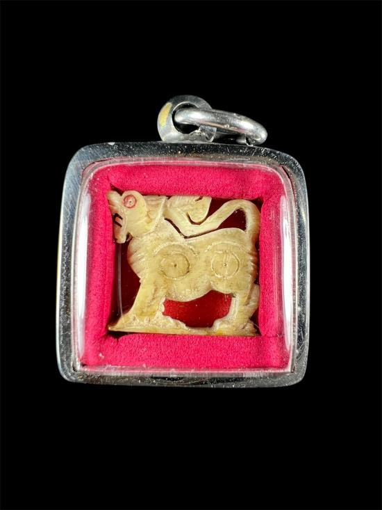 เคาะเดียวแดง.....สิงห์งาแกะ หลวงพ่อหอม วัดซากหมาก เลี่ยมกระเช้าเดิม ห่วงเชื่อม. ขนาดฐานกว้าง 1.5 ซม. สูง 1.4 ซม. |