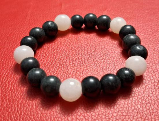 ประคำข้อมือหยกพม่าสีขาว+หยกดำจีนเรียกว่า หยกเนไฟรต์ (Nephrite) ขนาด 10-12 มิล ร้อยด้วยเอ็นยืด ขนาดฟรีไซด์ (กท.38) |