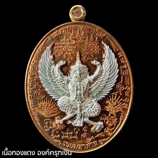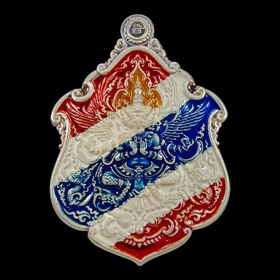 เหรียญพญาครุฑมหายันต์ พันพระคาถามหาเวทย์ หลวงปู่พัฒน์ วัดห้วยด้วน (วัดธารทหาร) อำเภอหนองบัว จังหวัดนครสวรรค์ เนื้อทองฝาบาตร ลงยาสีธงชาติ หมายเลข ๔๗ พร้อมกล่องเดิม |