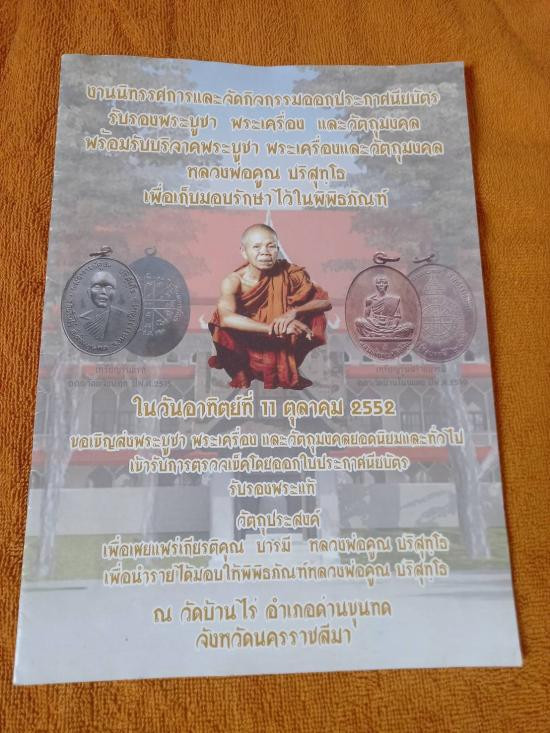 หนังสืองานนิทรรศการและกิจกรรมออกบัตรรับรองพระเครื่องพระบูชาหลวงพ่อคูณ วันที่11ต.ค.ปี2552 เพื่อนำรายใด้มอบให้พิพิธภัณฑ์หลวงพ่อคูณ วัดบ้านไร่ หนังสือกระดาษอารต์รวมปรก6หน้า คุณค่าสะสม เคาะเดียว