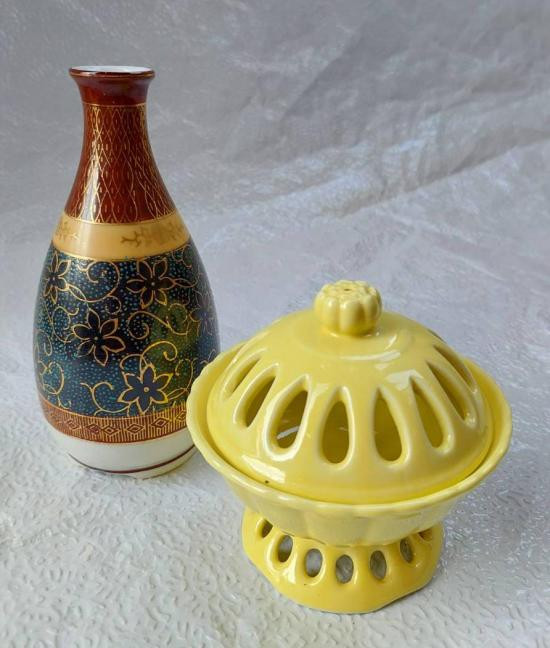 ***วัดใจ***แจกันเก่าเก็บเนื้อเซรามิกลายน้ำทอง งานของญี่ปุ่น สูง 6 นิ้ว กับที่จุดกำยาน เซรามิก |