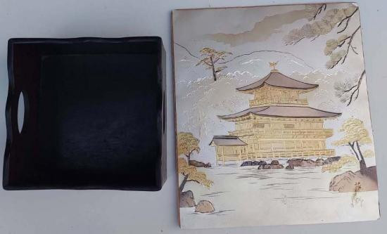 ***วัดใจ***กล่องไม้วินเทจญี่ปุ่น งานฝีมือเก่าเข้าเดือยไม้ งานเก่าน่าสะสม กับ ภาพแกะสลักโลหะชกิง (Chokin) วัดคินคะคุจิ เกียวโต เนื้อโลหะ 3 กษัตริย์ |