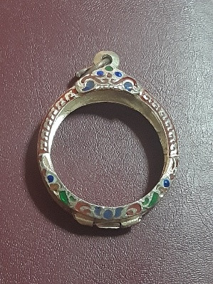 กรอบพระลงยากลมเนื้อโลหะ ขนาดวัดใน กว้าง 3.2 ซม. ยาว 3.2 ซม. สภาพสวย (เคาะเดียว) |