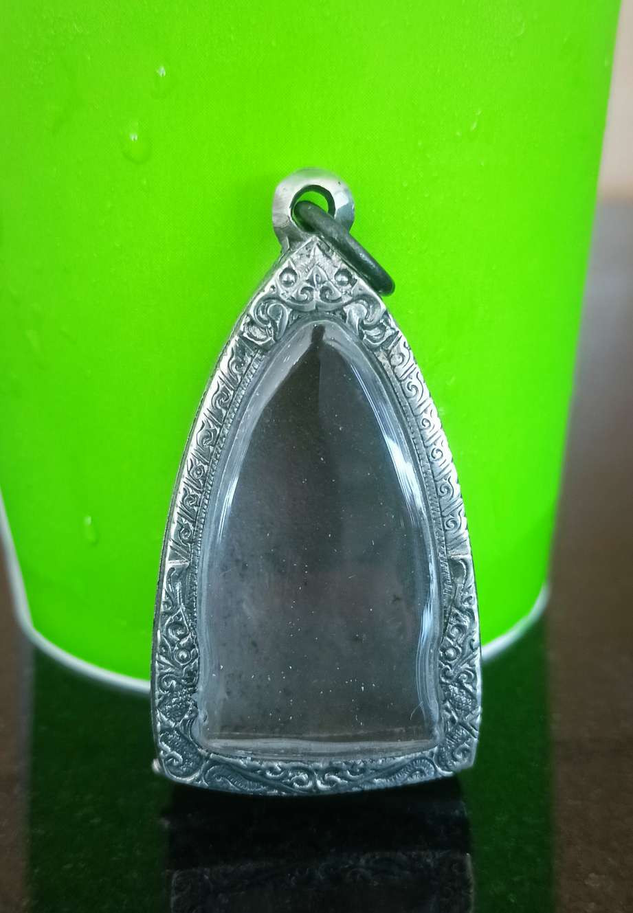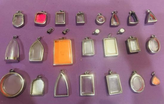 กรอบพระสามเหลี่ยมลงยา เนื้อโลหะผสม กว้าง 1.2 ซม. สูง 2.1 ซม. มีกรอบพลาสติกครบ (เคาะเดียว) |