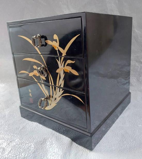 ***วัดใจ***กล่องไม้วินเทจญี่ปุ่น งานฝีมือเก่า 3 ลิ้นชัก สามารถวางพระบูชา 5 นิ้วได้ สีดำลายดอกไม้ |