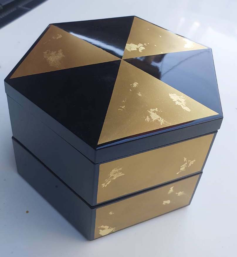 ***วัดใจ***กล่องไม้เคลือบแล็กเกอร์สีดำและปิดทองคำ ทรงหกเหลี่ยม 2 ชั้น ของยังไม่ได้ใช้เก่าเก็บ สวยๆ |