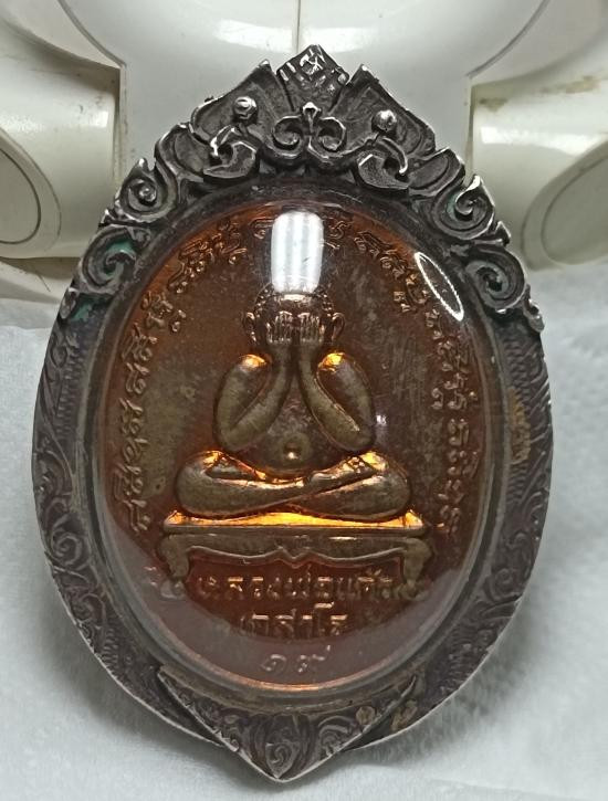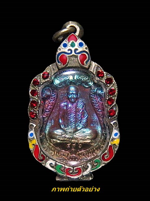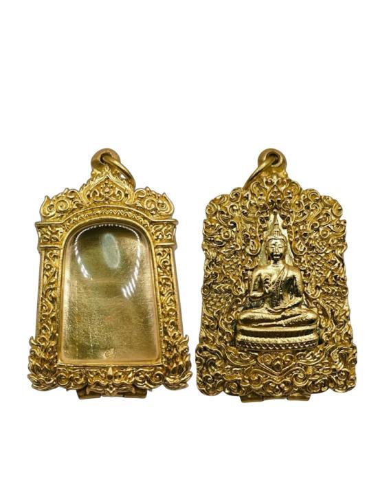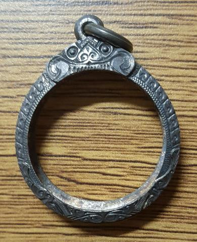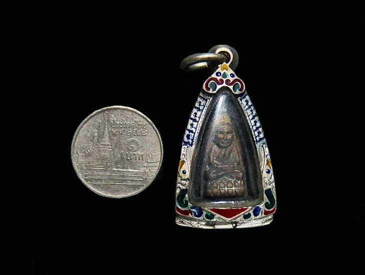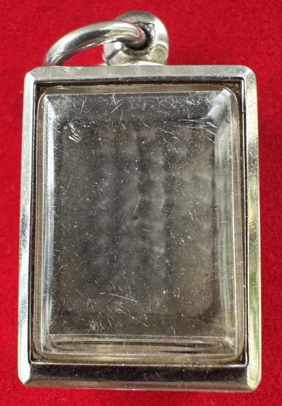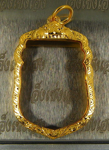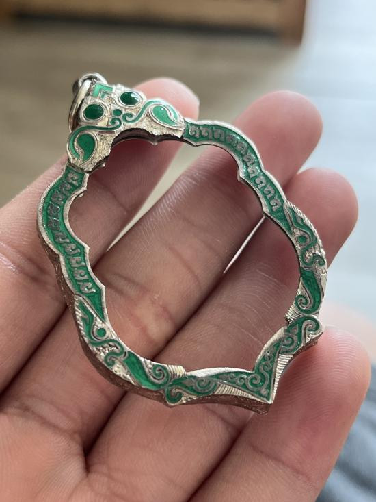 "วัดใจเคาะเดียวพระบ้าน" กรอบลงยา ไม่ทราบโลหะ เคยใส่พระท่ากระดาน กว้าง 3.5 สูง 6 ซ.ม. |