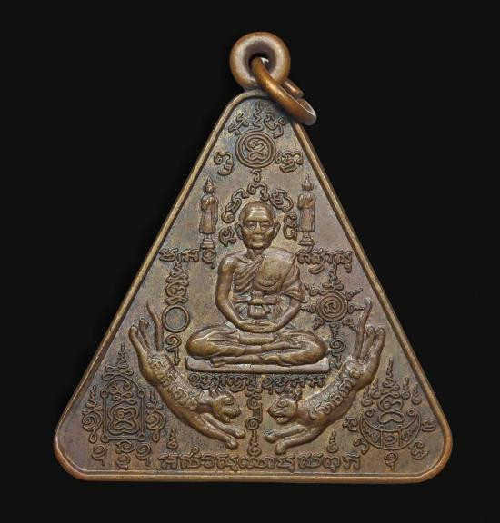 เหรียญสามเหลี่ยมยันต์เต็ม(กันระเบิด) หลวงพ่อคง วัดวังสรรพรส จังหวัดจันทบุรี ปี2524 เนื้อทองแดง |