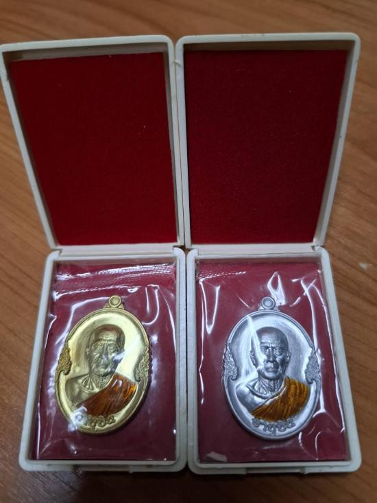 ชุด 2 องค์ เหรียญที่ระลึกอายุ 72 ปี พิมพ์อายุยืน >ทองเหลือง+ปีกเครื่องบิน พิเศษ ลงยาจีวร หมายเลข 105/71 หลวงพ่อทอง สุทธสีโล วัดบ้านไร่ จ.นครราชสีมา |