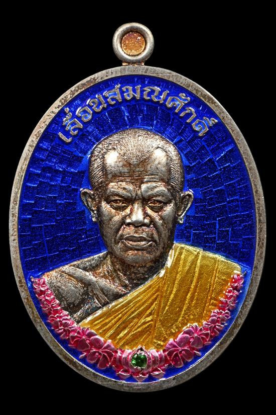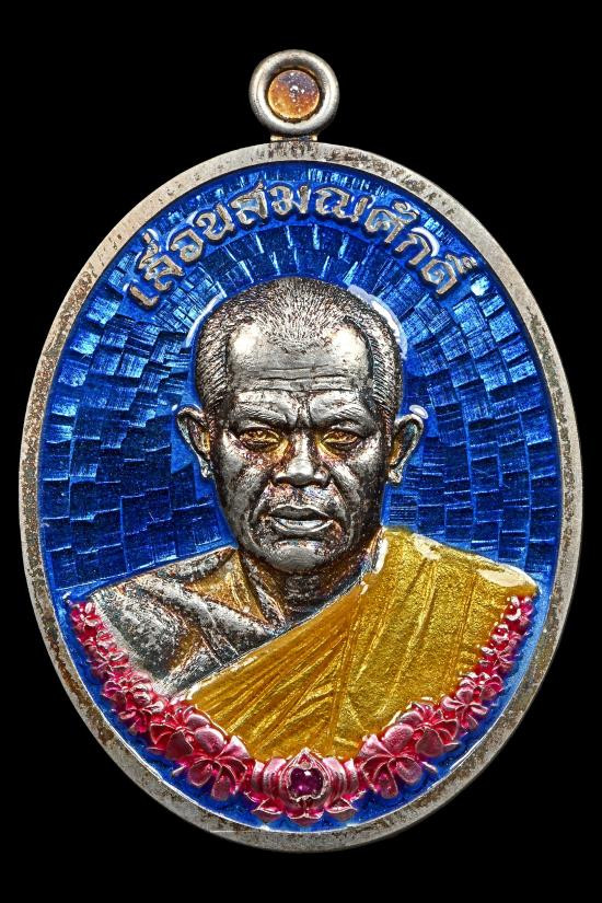 พระอาจารย์ต้อม วัดท่าสะแบง จ.ร้อยเอ็ด รุ่นรวยนะ9ดี พิมพ์เสือคู่บารมี ( เนื้อเงินลงยาแดงฝังพลอยเขียว ) No.126 พร้อมกล่องเดิม