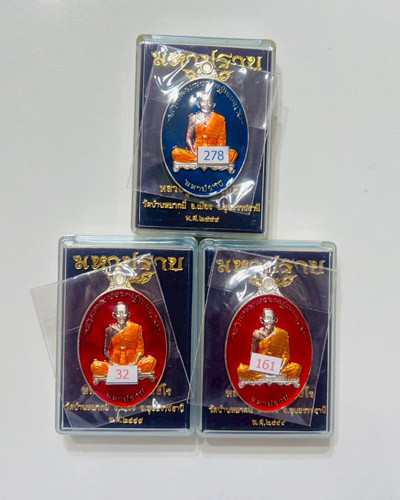 เหรียญเจริญพรเมตตามหานิยม หลวงปู่นิยม กมโล เนื้อเงินลงยาแดงไม่ตัดปีก หลังแบบ ๙รอบ กรรมการ no ๓ ควัดแจ้งนอก ปี 2555 |