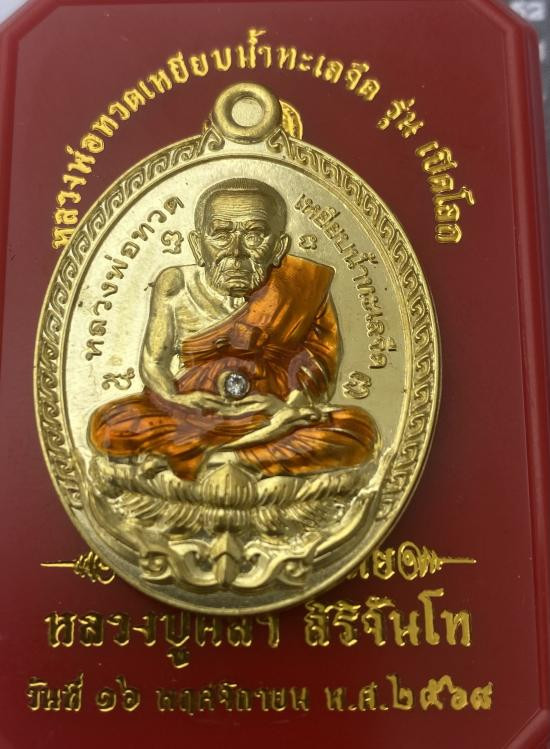 เหรียญ หลวงปู่จื่อ พนฺธมุตโต รุ่นเสือคาบดาบ เนื้อนวะลงยาขอบฝังเพชร หมายเลข76 มีกล่องครับ |