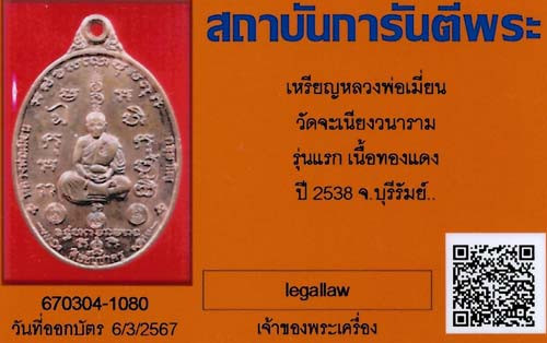 เหรียญรุ่นแรก ศิษย์บูชาครู หลวงพ่อเมียน วัดบ้านจะเนียง อ.กระสัง จ.บุรีรัมย์ ปี 2538+บัตรรับรองพระแท้*158 |
